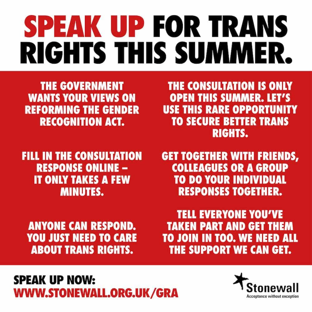 If you’d like to support the Come Out for Trans Equality campaign, Stonewall have provided a consultation form explaining the questions and providing its perspective to each question. You can sign the form, which takes about 5-10 minutes, before it closes on Friday 19 October and share your support using #ComeOutForTransEquality.