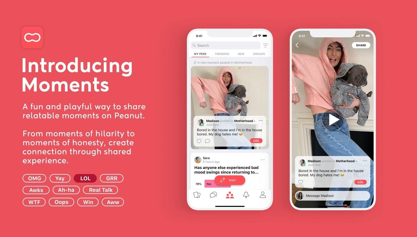 A continuation of Peanut's mission to create a safe and empowering space for women online, through all stages of motherhood, Moments’ mission is simple: they invite you to ‘share a photo or video, and tag it with an emotion such as “OMG”, “WTF” or “OOPS”.’