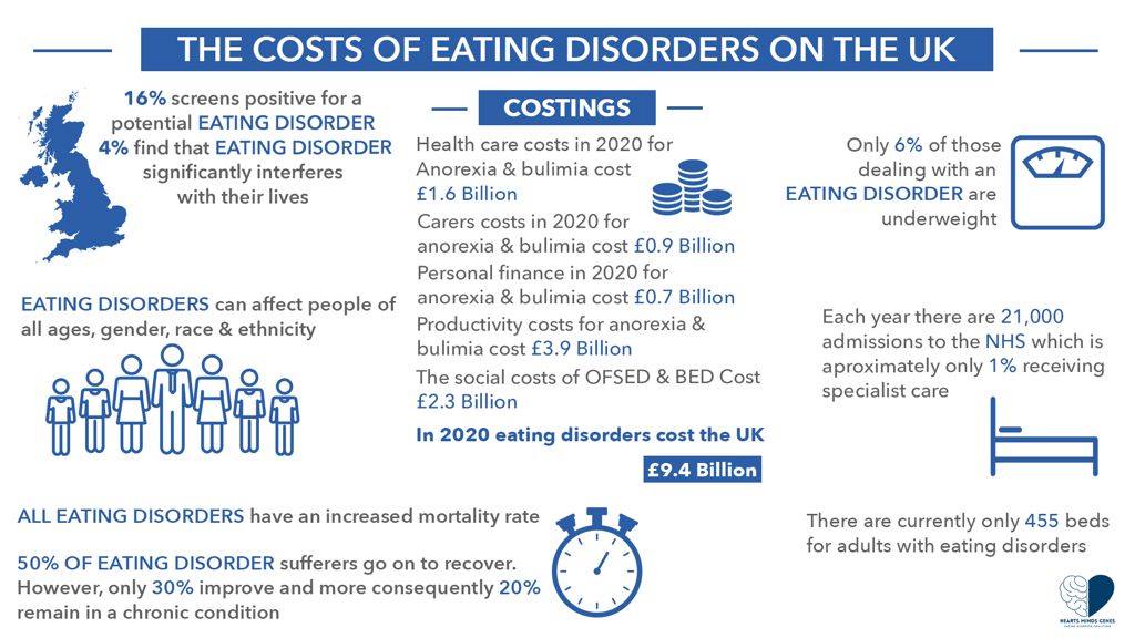 The report found that eating disorders cost the UK £8.8b in 2019 and £9.4b in 2020. Written by Hope Virgo, Professor Gerome Breen, Dr Agnes Ayton and EY, the report has highlighted some staggering costs of Eating Disorders in the UK, but note that with the right treatment pathways, the right public health messaging and a joined-up approach, not only will lives be saved, but we will be saving money for the NHS.